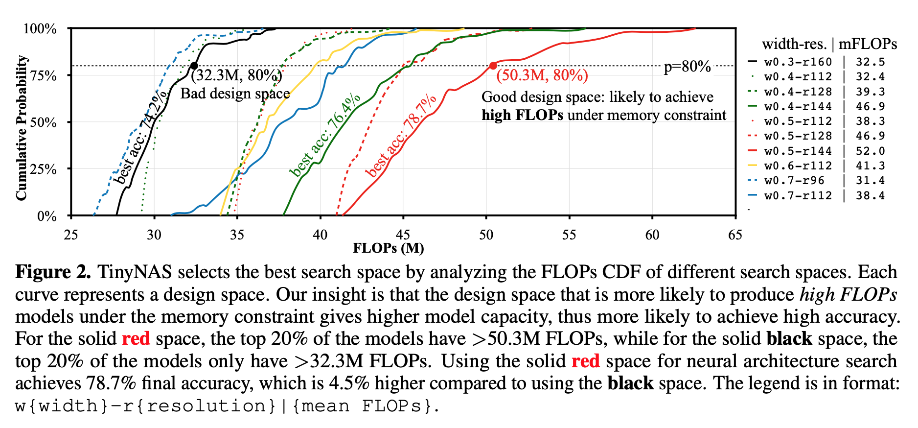 TinyNAS是一种两阶段的神经网络架构搜索的方法,它首先优化搜索空间以适配不同的资源约束,然后定制最佳搜索空间中的网络架构。经由该优化空间,它可以显著的提升最终模型的精度。在搜索空间方面,作者团队对输入分辨率和网络宽度方面进行搜索。输入分辨率范围R={48, 64, 80, ..., 192, 208, 224},网络宽度因子为W={0.2, 0.3, 0.4, ..., 1.0}。大概有108个可能的搜索空间配置,每个搜索空间配置包含3.3x1025个子网络。第一阶段的目的是寻找具有最高精度且可以满足资源约束的搜索空间。下图给出了不同配置搜索空间的FLOPs与CDF示意图。
