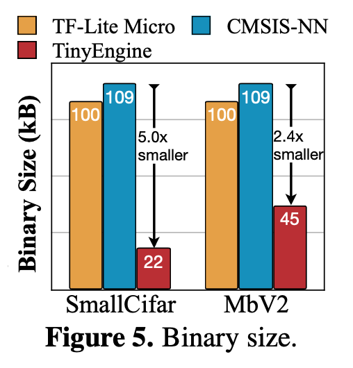 与此同时TinyEngine的库文件非常轻量,这使得其非常适合于MCU。不同于TF-Lite Micro需要准备所有的操作(比如conv、softmax)以支持跨模型推理;而TinyEngine仅仅需要编译必要的操作。下图给出了TF-Lite Micro、CMSIS-NN与TinyEngien的大小对比。