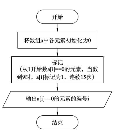 每当数到9时(k等于9).赋值a[i]=1,表示已取出,同时将k赋值为0,重新开始1~9数数。当取出的个数达到15个时(num等于15).检索数组各元素的值,为0时表示仍在圈内,就输出它的编号。流程图如下图: