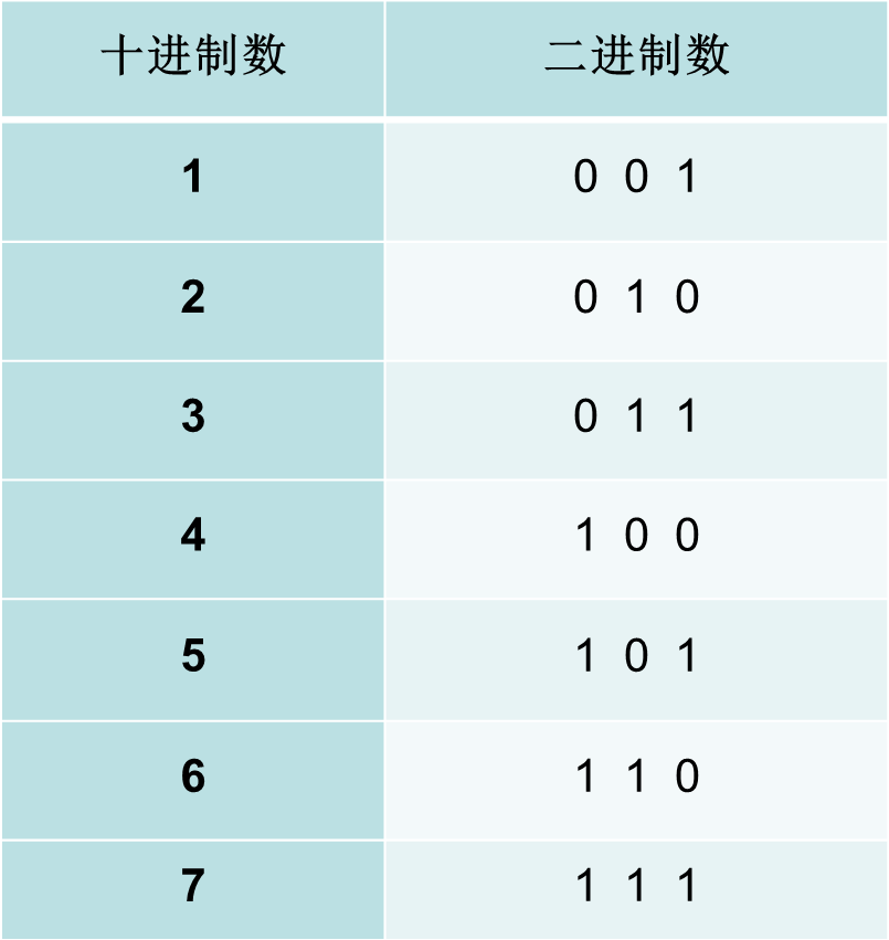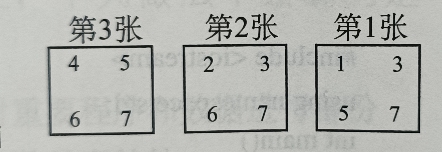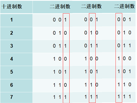 把十进制数1到7转化为二进制数后(如表下所示),把从右数第1位是1的数(1,3,5,7)写在第1张卡片上,把从右数第2位是1的数(2,3,6,7)写在第2张卡片上,把从右数第3位是1的数(4,5,6,7)写在第3张卡片上。