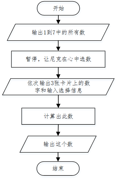 假如尼克选的数是4,出示第1张卡片时尼克的选择是“没有”,出示第2张卡片时尼克的选择是“没有”,出示第3张卡片时尼克的选择是“有”。我们将“有”用“1”表示,“没有”用“0”表示,可以将尼克的选择标识为(100)B,然后把二进制数(100)B转化为十进制数(4)(1×4+0×2-0×1=4),可以得出尼克选择的数是4。使用此方法可以算出尼克选择的任何数。流程图如下图: