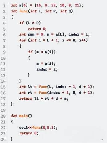 解析:A ,当func 函数被调用时,它首先检查L 是否大于R,这是递归的基本情况。如果L 大于R,函数返回0。函数的主要部分是一个for 循环,它在给定的索引范围[L, R] 内查找最大的元素m 和它的索引index。找到最大的元素后,函数对最大元素左侧和右 侧的子区间进行两次递归调用,分别是lt 和rt,并把深度参数d 增加1。 最后,函数返回左递归的结果lt 加上右递归的结果rt 再加上当前深度d 乘以最大元素值的总和。 在main 函数中,调用func(0, 5, 1) 开始递归处理,传入的参数表示全数组范围,从索引0 到5,以及初始深度1。然后打印返回的结果,并以状态码0 正常退出。 代码的运行结果是累加每次递归调用中找到的最大元素值乘以其深度的总和。
