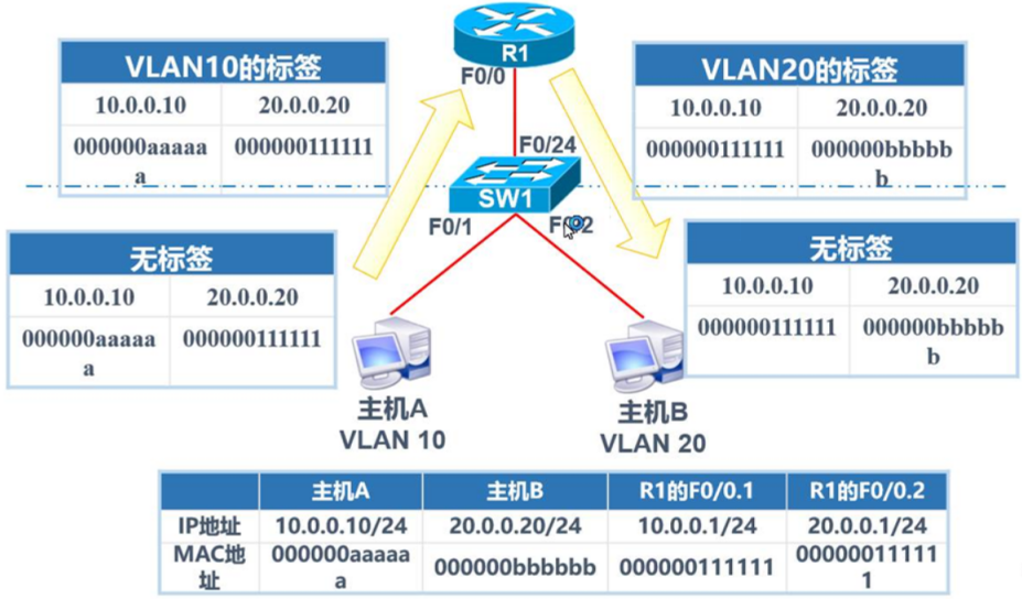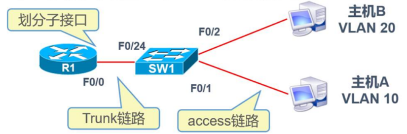 单臂路由(router-on-a-stick)是指在路由器的一个接口上通过配置子接口(或“逻辑接口”,并不存在真正物理接口)的方式,实现原来相互隔离的不同VLAN(虚拟局域网)之间的互联互通。