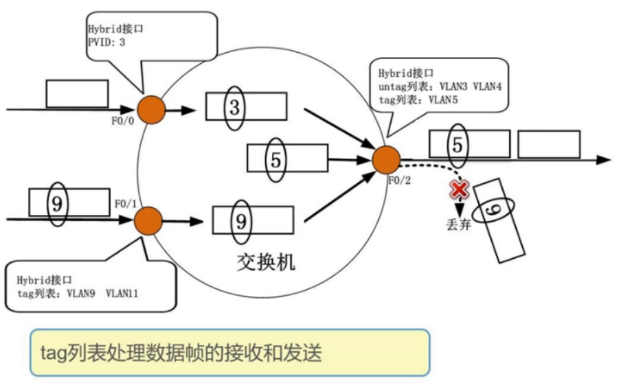 - 带有vlan 9标签的数据进入接口F0/1,接口查看到数据带有标签,接着查看tag列表,发现列表中存在对应标签,放通数据;