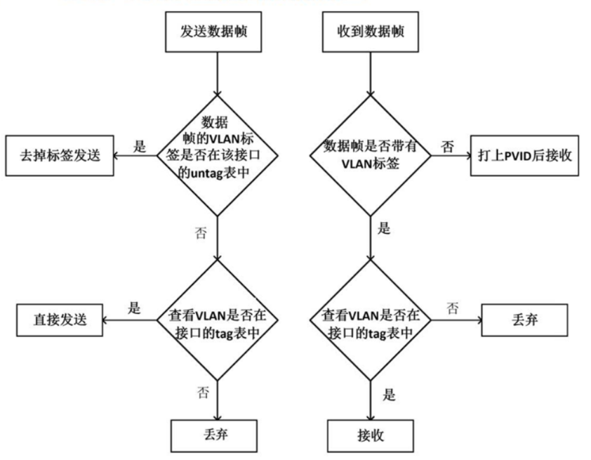 - 进口检查:查有无标签,有标,查tag表,有,放通,无,丢掉;无标,打上PVID后,放通。