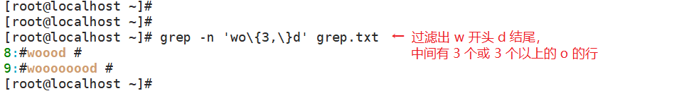 如:'o/{5/}' 匹配包含5个 o 的行。 x/{m,/} 重复字符 x ,至少 m 次; 如:'o/{5,/}' 匹配至少有5个 o 的行。 |