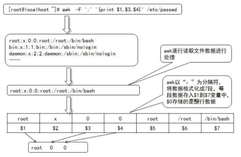 awk 借用 shell 中类似于位置变量的方法, 用 $1、$2、$3… 顺序地表示行(记录)中的不同字段。
