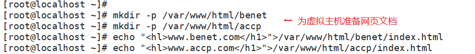 3 echo "<hl>www.benet.com</h1>">/var/www/html/benet/index.html