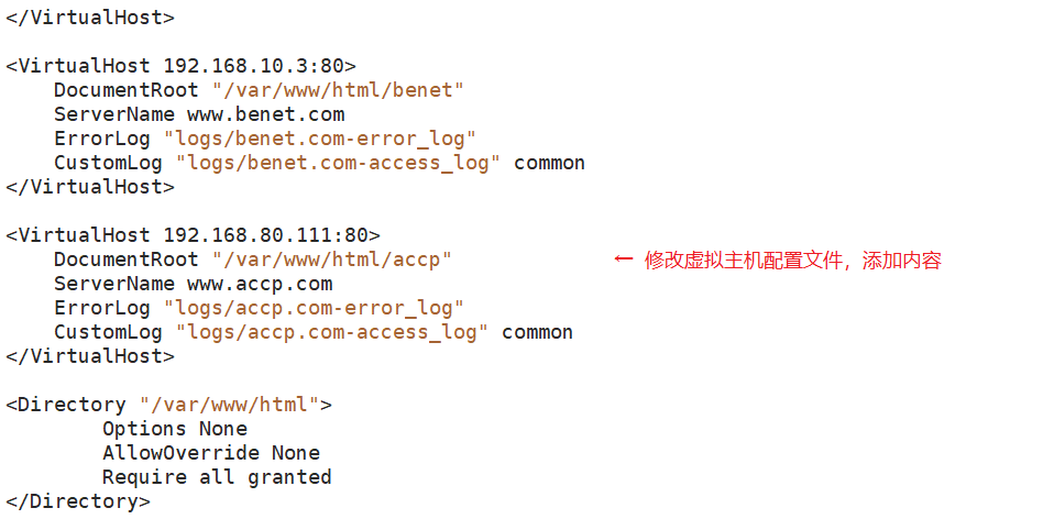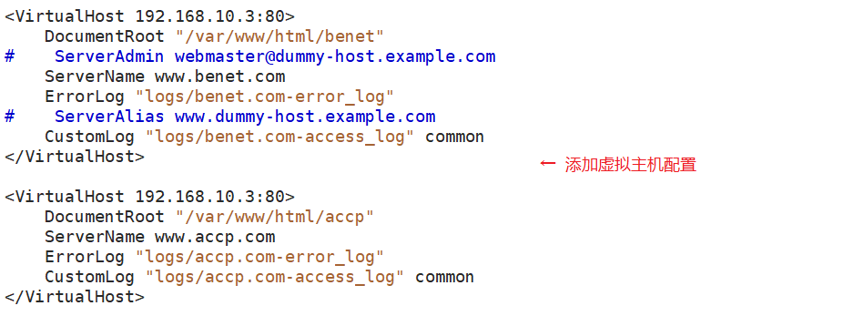 1 vim /usr/local/httpd/conf/extra/httpd-vhosts.conf #源码编译安装的虚拟主机配置文件路径