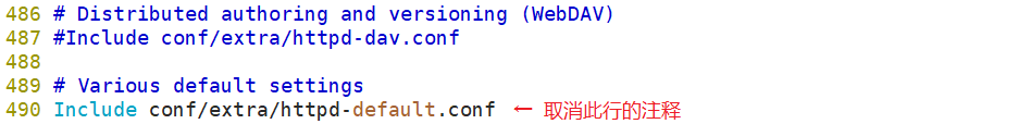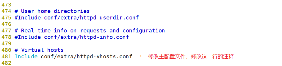 1 vim /usr/local/httpd/conf/httpd.conf #源码编译安装的httpd服务主配置文件路径 2 --483行--取消注释 3 Include conf/extra/httpd-vhosts.conf #加载独立的配置文件 4 5 #vim /etc/httpd/conf/httpd.conf #RPM或YUM安装的httpd服务主配置文件路径 6 IncludeOptional conf.d/*.conf #最后一行已默认开启此项 7 8 systemctl restart httpd