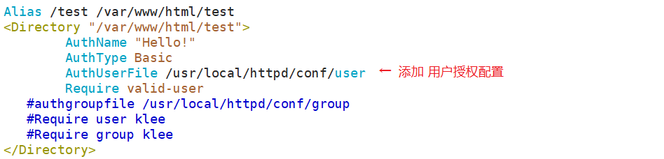 8 AuthUserFile /usr/local/httpd/conf/user #设置用于保存用户账号和密码的认证文件的路径