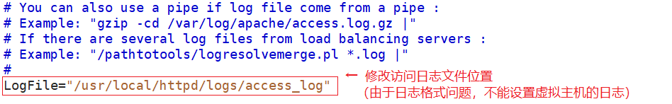 2 LogFile="/usr/local/httpd/logs/access_log" #修改访问日志文件位置(由于日志格式问题,不能设置虚拟主机的日志)