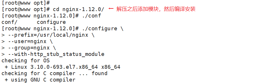 1 cd /opt 2 tar zxvf nginx-1.12.0.tar.gz -C /opt/ 3 4 cd nginx-1.12.0/ 5 6 ./configure \ 7 --prefix=/usr/local/nginx \ 8 --user=nginx \ 9 --group=nginx \ 10 --with-http_stub_status_module 11 12 make && make install