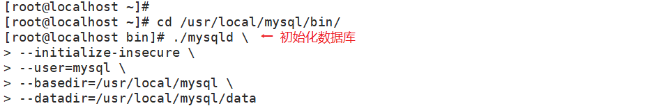 1 cd /usr/local/mysql/bin/ 2 3 mysqld \ 4 --initialize-insecure \ 5 --user=mysql \ 6 --basedir=/usr/local/mysql \ 7 --datadir=/usr/local/mysql/data