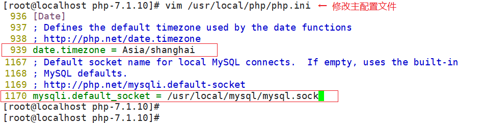 1 调整主配置文件: 2 3 cp /opt/php-7.1.10/php.ini-development /usr/local/php/php.ini 4 vim /usr/local/php/php.ini 5 --1170行--修改 6 mysqli.default_socket = /usr/local/mysql/mysql.sock 7 --939行--取消注释,修改 8 date.timezone = Asia/Shanghai 9 10 php -m #验证安装的模块