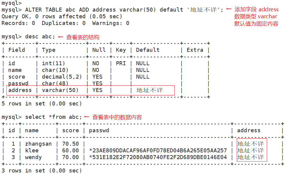 - ALTER TABLE 表名 ADD address varchar(50) default '地址不详';
