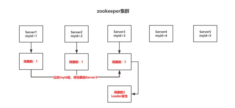 假设ZooKeeper由5台服务器组成,SID分别为1、2、3、4、5,ZXID分别为8、8、8、7、7,并且此时SID为3的服务器是Leader。某一时刻,3和5服务器出现故障,因此开始进行Leader选举。