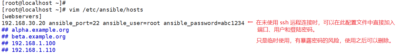 1 [webservers] 2 192.168.229.80 ansible_port=22 ansible_user=root ansible_password=abc1234