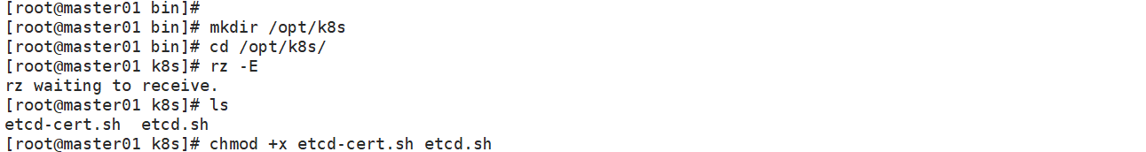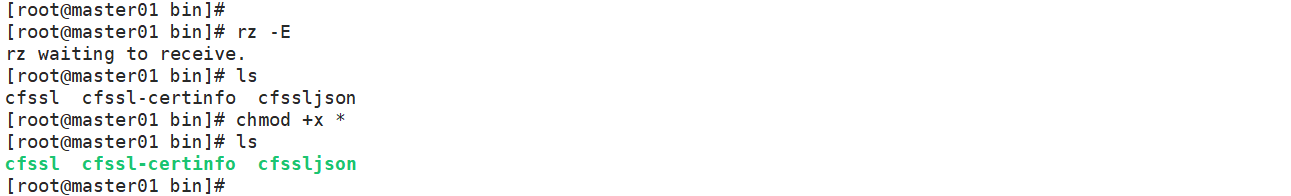 1 [root@master01 etcd-cert]# cd /usr/local/bin/ 2 [root@master01 bin]# rz -E(cfssl cfssl-certinfo cfssljson) 3 [root@master01 bin]# chmod +x * 4 [root@master01 bin]# ls 5 cfssl cfssl-certinfo cfssljson