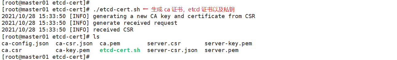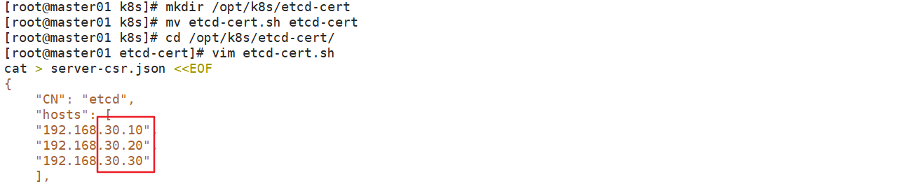 1 #创建k8s工作目录 2 [root@master01 opt]# mkdir /opt/k8s 3 [root@master01 opt]# cd /opt/k8s/ 4 5 #上传etcd-cert.sh 和 etcd.sh 到/opt/k8s目录 6 [root@master01 k8s]# ls etcd-cert.sh etcd.sh 7 etcd-cert.sh etcd.sh 8 9 #添加x 权限 10 [root@master01 k8s]# chmod +x etcd-cert.sh etcd.sh 11 12 #创建用于生成CA证书,etcd服务器证书及私钥的目录 13 [root@master01 k8s]# mkdir /opt/k8s/etcd-cert 14 [root@master01 k8s]# mv etcd-cert.sh etcd-cert 15 [root@master01 k8s]# cd /opt/k8s/etcd-cert/ 16 17 #注意,看一下脚本,把ip改为自己的 18 [root@master01 etcd-cert]# vim etcd-cert.sh 19 20 #执行脚本,生成CA证书,etcd服务器证书以及私钥 21 [root@master01 etcd-cert]# ./etcd-cert.sh 22 23 [root@master01 etcd-cert]# ls 24 ca-config.json ca-csr.json ca.pem server.csr server-key.pem 25 ca.csr ca-key.pem etcd-cert.sh server-csr.json server.pe