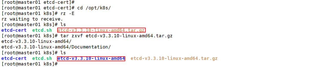 1 #etcd 二进制包地址: https://github.com/etcd-io/etcd/release 2 3 #上传etcd-v3.3.10 包到/opt/k8s目录中,解压 4 [root@master01 k8s]# ls etcd-v3.3.10-linux-amd64.tar.gz 5 etcd-v3.3.10-linux-amd64.tar.gz 6 7 [root@master01 k8s]# tar xf etcd-v3.3.10-linux-amd64.tar.gz 8 9 [root@master01 k8s]# ls etcd-v3.3.10-linux-amd64 10 Documentation etcd etcdctl README-etcdctl.md README.md READMEv2-etcdctl.md