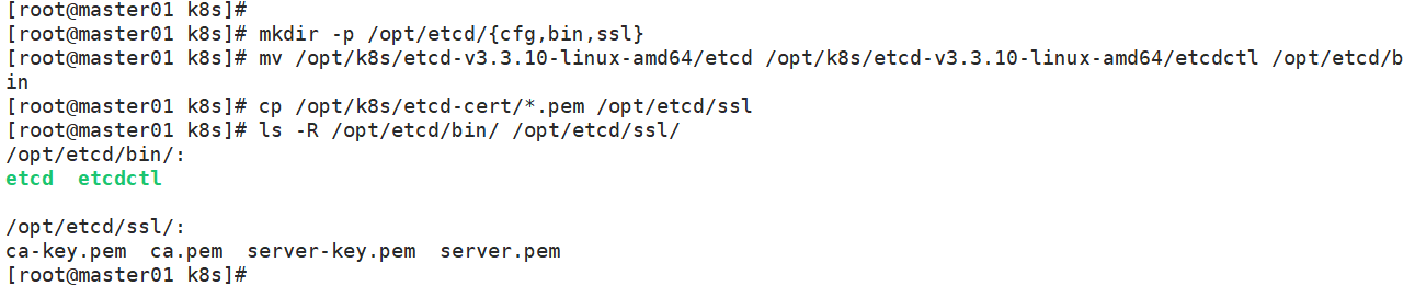 1 [root@master01 k8s]# mkdir -p /opt/etcd/{cfg,bin,ssl} 2 [root@master01 k8s]# mv /opt/k8s/etcd-v3.3.10-linux-amd64/etcd /opt/k8s/etcd-v3.3.10-linux-amd64/etcdctl /opt/etcd/bin/ 3 [root@master01 k8s]# cp /opt/k8s/etcd-cert/*.pem /opt/etcd/ssl/ 4 5 [root@master01 k8s]# ls -R /opt/etcd/bin/ /opt/etcd/ssl/ 6 /opt/etcd/bin/: 7 etcd etcdctl 8 9 /opt/etcd/ssl/: 10 ca-key.pem ca.pem server-key.pem server.pem