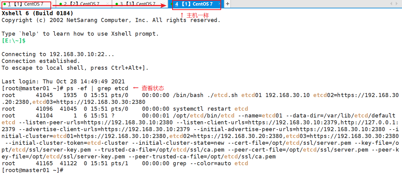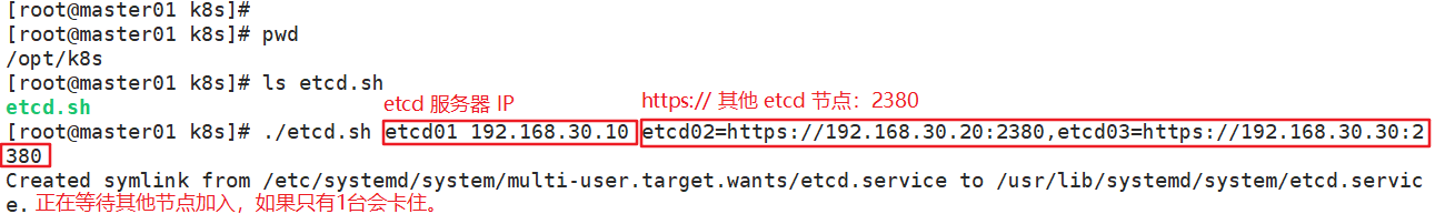 1 [root@master01 k8s]# pwd 2 /opt/k8s 3 [root@master01 k8s]# ls etcd.sh 4 etcd.sh 5 6 [root@master01 k8s]# ./etcd.sh etcd01 192.168.23.103 etcd02=https://192.168.23.104:2380,etcd03=https://192.168.23.105:2380 7 8 #新开一个终端查看 9 [root@master01 k8s]# ps -ef | grep etcd