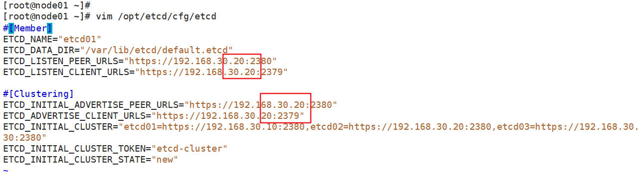 1 [root@master01 k8s]# scp -r /opt/etcd/ 192.168.23.104:/opt/ 2 [root@master01 k8s]# scp -r /opt/etcd/ 192.168.23.105:/opt/ 3 4 #node1修改etcd文件 5 [root@node01 cfg]# vim /opt/etcd/cfg/etcd 6 #[Member] 7 ETCD_NAME="etcd02 8 ETCD_DATA_DIR="/var/lib/etcd/default.etcd" 9 ETCD_LISTEN_PEER_URLS="https://192.168.23.104:2380" 10 ETCD_LISTEN_CLIENT_URLS="https://192.168.23.104:2379" 11 12 #[Clustering] 13 ETCD_INITIAL_ADVERTISE_PEER_URLS="https://192.168.23.104:2380" 14 ETCD_ADVERTISE_CLIENT_URLS="https://192.168.23.104:2379" 15 ETCD_INITIAL_CLUSTER="etcd01=https://192.168.23.103:2380,etcd02=https://192.168.23.104:2380,etcd03=https://192.168.23.105:2380" 16 ETCD_INITIAL_CLUSTER_TOKEN="etcd-cluster" 17 ETCD_INITIAL_CLUSTER_STATE="new" 18 19 #node2修改etcd文件 20 [root@node02 ~]# vim /opt/etcd/cfg/etcd 21 #[Member] 22 ETCD_NAME="etcd03" 23 ETCD_DATA_DIR="/var/lib/etcd/default.etcd" 24 ETCD_LISTEN_PEER_URLS="https://192.168.23.105:2380" 25 ETCD_LISTEN_CLIENT_URLS="https://192.168.23.105:2379" 26 27 #[Clustering] 28 ETCD_INITIAL_ADVERTISE_PEER_URLS="https://192.168.23.105:2380" 29 ETCD_ADVERTISE_CLIENT_URLS="https://192.168.23.105:2379" 30 ETCD_INITIAL_CLUSTER="etcd01=https://192.168.23.103:2380,etcd02=https://192.168.23.104:2380,etcd03=https://192.168.23.105:2380" 31 ETCD_INITIAL_CLUSTER_TOKEN="etcd-cluster" 32 ETCD_INITIAL_CLUSTER_STATE="new"