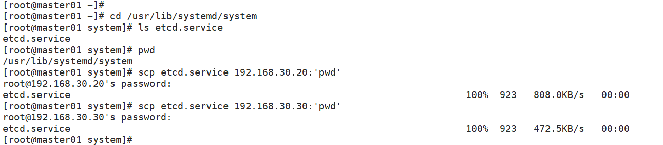 1 [root@master01 k8s]# cd /usr/lib/systemd/system/ 2 [root@master01 system]# ls etcd.service 3 etcd.service 4 [root@master01 system]# pwd 5 /usr/lib/systemd/system 6 [root@master01 system]# scp etcd.service 192.168.23.104:`pwd` 7 [root@master01 system]# scp etcd.service 192.168.23.105:`pwd`