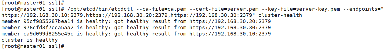1 [root@master01 k8s]# systemctl restart etcd 2 [root@master01 k8s]# systemctl enable etcd 3 [root@master01 k8s]# systemctl status etcd 4 5 [root@node01 cfg]# systemctl daemon-reload 6 [root@node01 cfg]# systemctl start etcd 7 [root@node01 cfg]# systemctl enable etcd 8 [root@node01 cfg]# systemctl status etcd 9 10 [root@node02 ~]# systemctl daemon-reload 11 [root@node02 ~]# systemctl restart etcd 12 [root@node02 ~]# systemctl enable etcd.service 13 [root@node02 ~]# systemctl status etcd