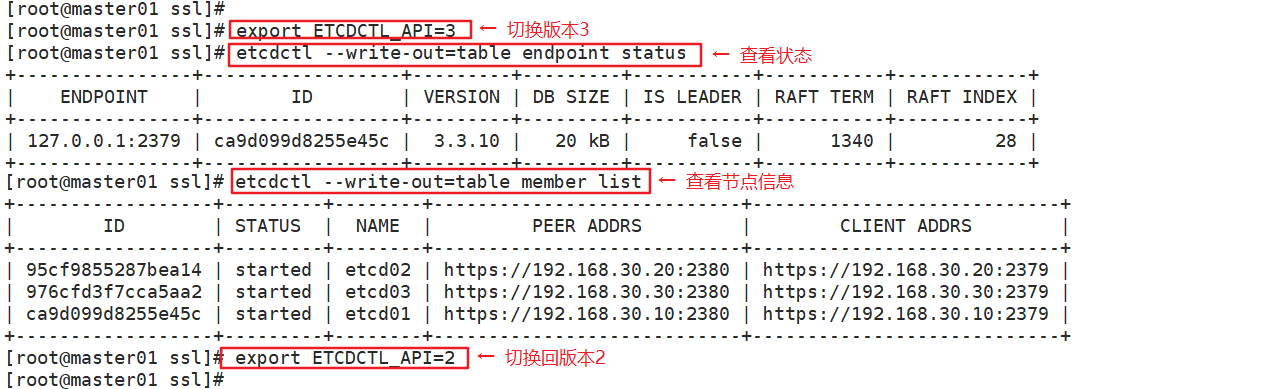 1 export ETCDCTL_API=3 2 #v2和v3命令略有不同,etcd2 和etcd3也是不兼容的,默认是v2版本 3 etcdctl --write-out=table endpoint status 4 etcdctl --write-out=table member list 5 export ETCDCTL_API=2 6 #再切回v2版本