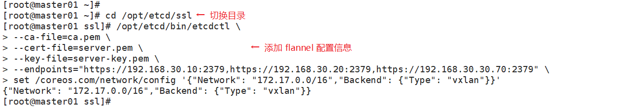 1 cd /opt/etcd/ssl 2 /opt/etcd/bin/etcdctl \ 3 --ca-file=ca.pem \ 4 --cert-file=server.pem \ 5 --key-file=server-key.pem \ 6 --endpoints="https://192.168.229.90:2379,https://192.168.229.80:2379,https://192.168.229.70:2379" \ 7 set /coreos.com/network/config '{"Network": "172.17.0.0/16","Backend": {"Type": "vxlan"}}'