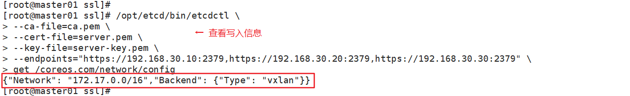 1 /opt/etcd/bin/etcdctl \ 2 --ca-file=ca.pem \ 3 --cert-file=server.pem \ 4 --key-file=server-key.pem \ 5 --endpoints="https://192.168.229.90:2379,https://192.168.229.80:2379,https://192.168.229.70:2379" \ 6 get /coreos.com/network/config