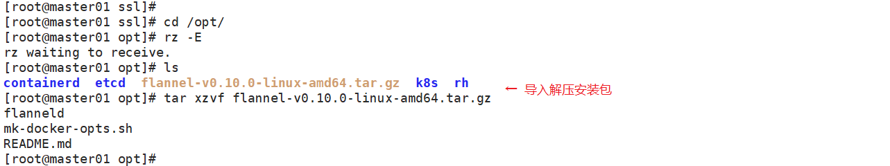 1 cd /opt 2 tar zxvf flannel-v0.10.0-1inux-amd64.tar.gz 3 flanneld 4 #flanneld为主要的执行文件 5 mk-docker-opts.sh 6 #mk-docker-opts . sh脚本用于生成Docker启动参数 7 README.md