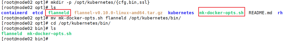 1 mkdir -p /opt/kubernetes/{cfg,bin,ss1} 2 cd /opt 3 mv mk-docker-opts.sh flanneld /opt/kubernetes/bin/