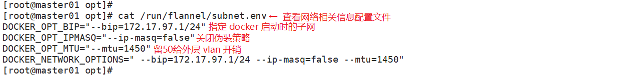 1 cat /run/flannel/subnet.env 2 DOCKER_OPT_BIP="--bip=172.17.26.1/24" 3 DOCKER_OPT_IPMASQ="--ip-masq= false" 4 DOCKER_OPT_MTU="--mtu=1450" 5 DOCKER_NETWORK_OPTIONS=" --bip=172.17.26.1/24 --ip-masq=false --mtu=1450"