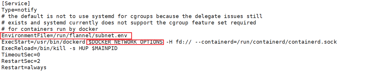 7 EnvironmentFile=/run/flannel/subnet.env 8 #添加