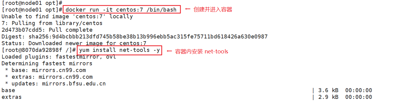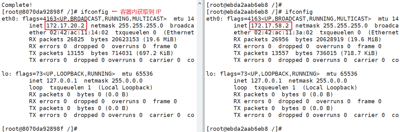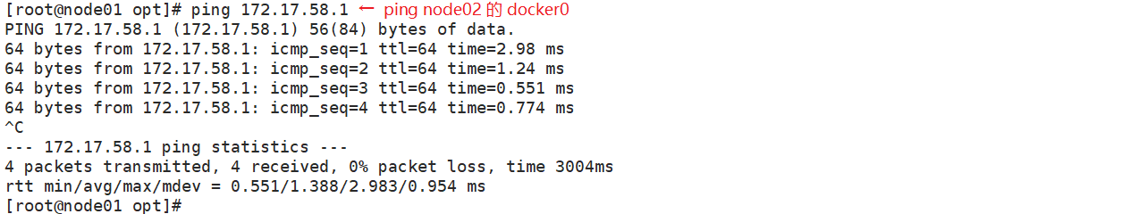 1 ping 172.17.91.1 2 docker run -it centos:7 /bin/bash # node1 和 node2 都运行该命令 3 yum install net-tools -y # node1 和 node2 都运行该命令 4 ifconfig //再次测试 ping 通两个 node 中的 centos:7 容器