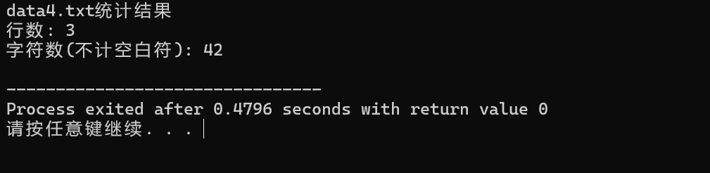1 #include <stdio.h> 2 3 void my_print() 4 { 5 FILE *fp; 6 fp = fopen("data4.txt", "r"); 7 char a; 8 9 if (fp == NULL) 10 { 11 printf("fail to open file to read\n"); 12 return; 13 } 14 15 int count_line = 1; 16 int count_only_char = 0; 17 18 while ((a = fgetc(fp))! = EOF) 19 { 20 if (a == '\n') 21 count_line += 1; 22 if (a != ' ' && a != '\n') 23 count_only_char += 1; 24 } 25 printf("行数: %d\n字符数(不计空白符): %d\n", count_line, count_only_char); 26 27 fclose(fp); 28 } 29 30 int main() 31 { 32 printf("data4.txt统计结果\n"); 33 my_print(); 34 return 0; 35 }