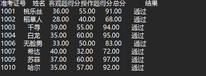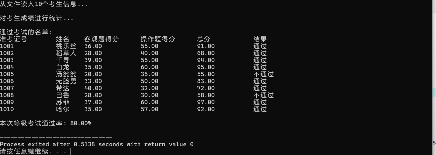 1 #include <stdio.h> 2 #include <string.h> 3 4 #define N 10 5 6 typedef struct 7 { 8 long id; // 准考证号 9 char name[20]; // 姓名 10 float objective; // 客观题得分 11 float subjective; // 操作题得分 12 float sum; // 总分 13 char result[10]; // 考试结果 14 } STU; 15 16 // 函数声明 17 void read(STU st[], int n); 18 void write(STU st[], int n); 19 void output(STU st[], int n); 20 int process(STU st[], int n, STU st_pass[]); 21 22 int main() 23 { 24 STU stu[N], stu_pass[N]; 25 int cnt; 26 double pass_rate; 27 28 printf("从文件读入%d个考生信息...\n", N); 29 read(stu, N); 30 31 printf("\n对考生成绩进行统计...\n"); 32 cnt = process(stu, N, stu_pass); 33 34 printf("\n通过考试的名单:\n"); 35 output(stu, N); // 输出所有考生完整信息到屏幕 36 write(stu, N); // 输出考试通过的考生信息到文件 37 38 pass_rate = 1.0 * cnt / N; 39 printf("\n本次等级考试通过率: %.2f%%\n", pass_rate*100); 40 41 return 0; 42 } 43 44 // 把所有考生完整信息输出到屏幕上 45 // 准考证号,姓名,客观题得分,操作题得分,总分,结果 46 void output(STU st[], int n) 47 { 48 int i; 49 50 printf("准考证号\t姓名\t客观题得分\t操作题得分\t总分\t\t结果\n"); 51 for (i = 0; i < n; i++) 52 printf("%ld\t\t%s\t%.2f\t\t%.2f\t\t%.2f\t\t%s\n", st[i].id, st[i].name, st[i].objective, st[i].subjective, st[i].sum, st[i].result); 53 } 54 55 // 从文本文件examinee.txt读入考生信息:准考证号,姓名,客观题得分,操作题得分 56 void read(STU st[], int n) 57 { 58 int i; 59 FILE *fin; 60 61 fin = fopen("examinee.txt", "r"); 62 if (!fin) 63 { 64 printf("fail to open file\n"); 65 return; 66 } 67 68 while (!feof(fin)) 69 { 70 for (i = 0; i < n; i++) 71 fscanf(fin, "%ld %s %f %f", &st[i].id, st[i].name, &st[i].objective, &st[i].subjective); 72 } 73 74 fclose(fin); 75 } 76 77 // 把通过考试的考生完整信息写入文件list_pass.txt 78 // 准考证号,姓名,客观题得分,操作题得分,总分,结果 79 void write(STU s[], int n) 80 { 81 int i; 82 FILE *fp; 83 fp = fopen("list.txt", "w"); 84 if (fp == NULL) 85 { 86 printf("fail to open file to write\n"); 87 return; 88 } 89 90 fprintf(fp, "准考证号\t姓名\t客观题得分\t操作题得分\t总分\t\t结果\n"); 91 92 for (i = 0; i < n; i++) 93 { 94 if (s[i].sum >= 60) 95 { 96 fprintf(fp, "%ld%10s%10.2f%10.2f%10.2f%10s\n", s[i].id, s[i].name, s[i].objective, s[i].subjective, s[i].sum, s[i].result); 97 } 98 } 99 100 fclose(fp); 101 } 102 // 对考生信息进行处理:计算每位考生考试总分、结果;统计考试通过的人数 103 int process(STU st[], int n, STU st_pass[]) 104 { 105 int cnt = 0; 106 int i; 107 108 for (i = 0; i < n; i++) 109 { 110 st[i].sum = st[i].objective + st[i].subjective; 111 112 if (st[i].sum >= 60) 113 { 114 strcpy(st[i].result, "通过"); 115 cnt++; 116 } 117 else 118 strcpy(st[i].result, "不通过"); 119 } 120 121 return cnt; 122 }