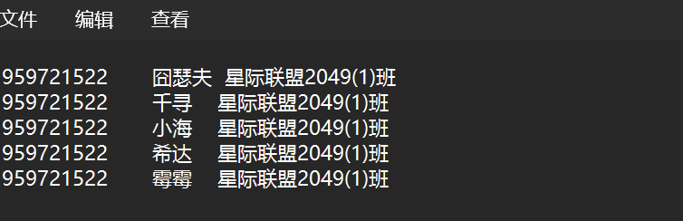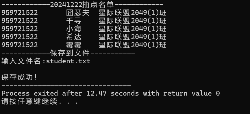 1 #include <stdio.h> 2 #include <time.h> 3 #define a 10 4 #define b 100 5 #define c 100 6 7 typedef struct 8 { 9 int number; 10 char name[b]; 11 char class[c]; 12 int flag; 13 } STU; 14 15 void read(STU s[]) 16 { 17 int i; 18 FILE *fp; 19 20 fp = fopen("list.txt", "r"); 21 if (!fp) 22 { 23 printf("fail to open file to read\n"); 24 return; 25 } 26 27 while (!feof(fp)) 28 { 29 for (i = 0; i < 80; i++) 30 fscanf(fp, "%s%s%s", &s[i].number, &s[i].name, &s[i].class); 31 } 32 33 fclose(fp); 34 } 35 36 void select(STU s[]) 37 { 38 int i, random; 39 srand (time (NULL)); 40 41 for (i = 0; i < 5; i++) 42 { 43 do 44 { 45 random = rand() % 80; 46 }while (s[random].flag == 1); 47 48 s[random].flag = 1; 49 s[i] = s[random]; 50 } 51 } 52 void store(STU s[], char *student) 53 { 54 FILE *fp; 55 int i; 56 fp = fopen("student.txt", "w"); 57 if (! fp) 58 { 59 printf("fail to open file to write\n"); 60 return; 61 } 62 for (i = 0; i < 5; i++) 63 { 64 fprintf(fp,"%-16d%-8s%s\n",s[i].number,s[i].name,s[i].class); 65 } 66 67 fclose(fp); 68 } 69 70 int main() 71 { 72 STU s[80]; 73 char student[100]; 74 int i; 75 for (i = 0; i < 80; i++) 76 s[i].flag = 0; 77 78 printf("------------20241222抽点名单------------\n"); 79 read(s); 80 select(s); 81 82 for (i = 0; i < 5; i++) 83 printf("%-16d%-8s%s\n",s[i].number,s[i].name,s[i].class); 84 85 printf("------------保存到文件-----------\n"); 86 printf("输入文件名:"); 87 gets(student); 88 printf("\n"); 89 90 store(s,student); 91 printf("保存成功!"); 92 93 return 0; 94 }