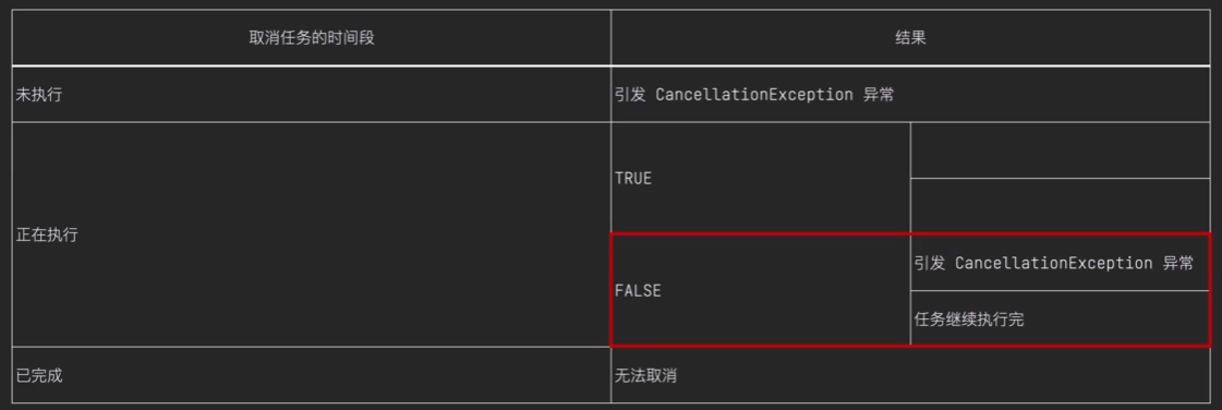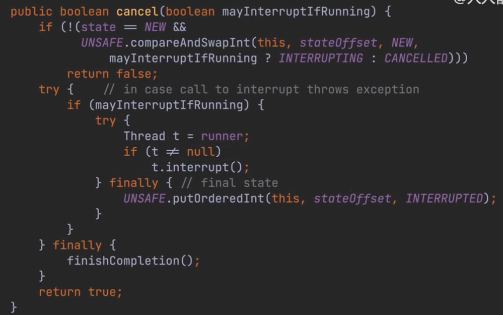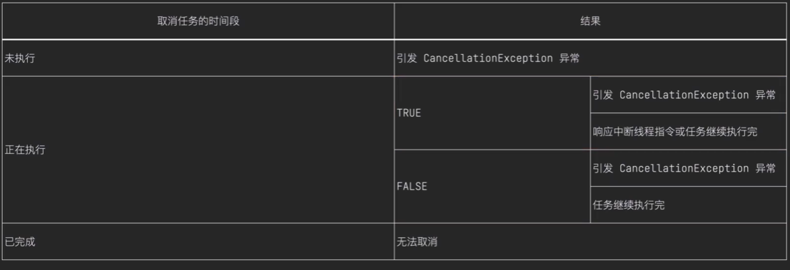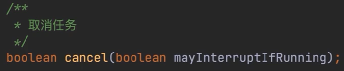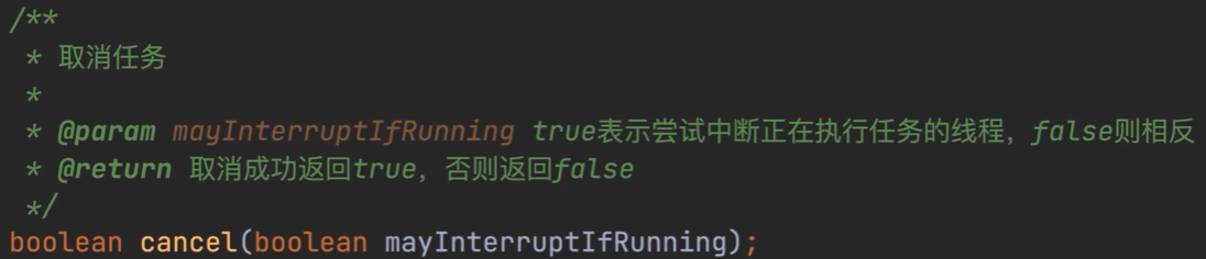 源码中没有处理false这种情况,说明参数只有在响应中断线程指令的场景下传出,除此以外,传false。另外,这个参数只对执行中的任务有意义。cancel方法返回一个布尔类型的结果,任务取消成功,返回true,否则返回false。