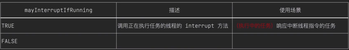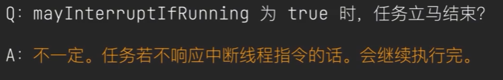 他有一个布尔类型的参数,如果为true的话,表示尝试中断正在执行任务的线程,也就是调用线程的interrupt的方法。这一点也可以从源码中看到。