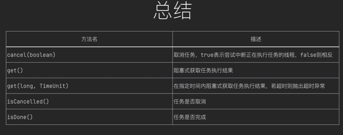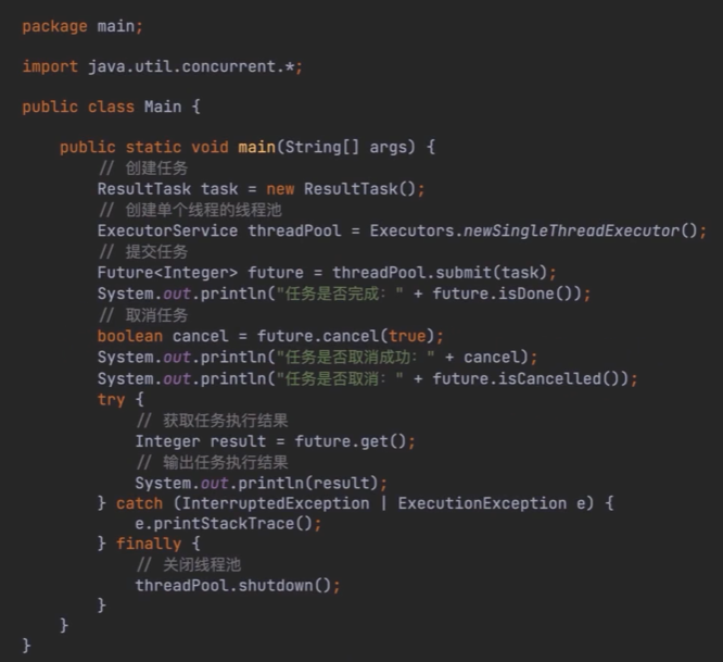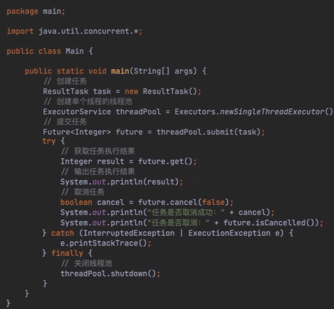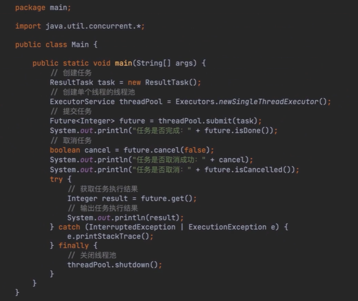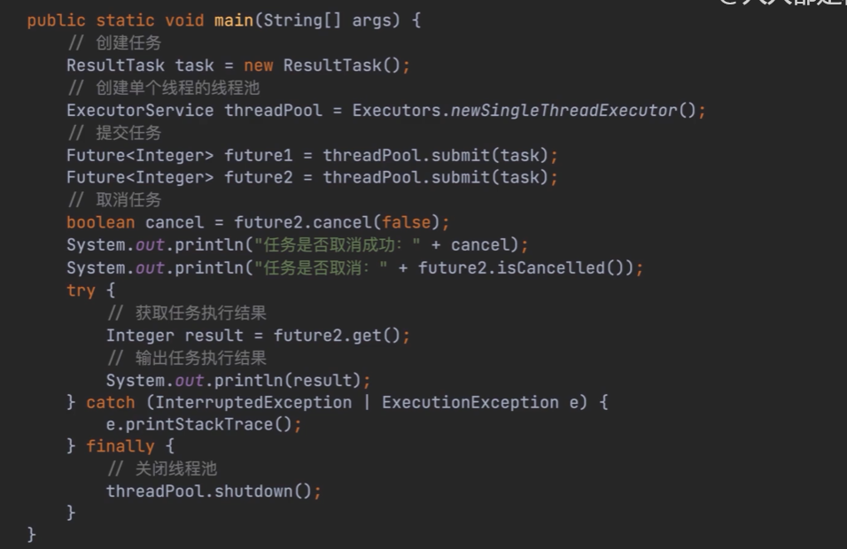 传true传false无所谓,因为这个参数只会影响执行中的任务,对未执行的任务没有影响。接受cancel方法的返回值,并输出cancel任务是否取消成功。另外,我们在调用FUTURE2的一次cancel的方法再次确认任务是否真的被取消了,接下来我们来获取第二个任务的执行结果,输出该结果,最后别忘了在finally代码块中关闭线程池,至此main方法编写完成,整个例子也编写完成.