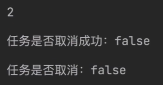 执行改写后的程序,观察执行结果,从执行结果来看,程序输出一加一的结果二,任务取消失败,再次。任务真的是取消失败了,由此可见已完成的任务是无法被取消的。