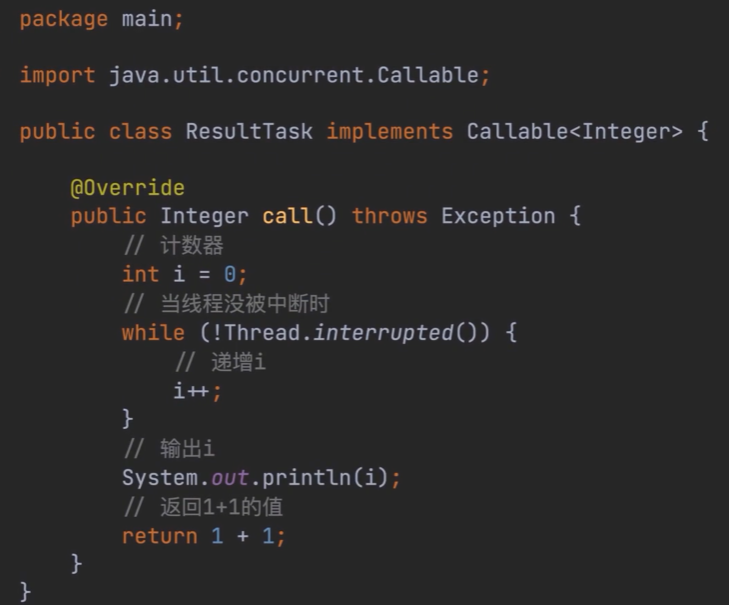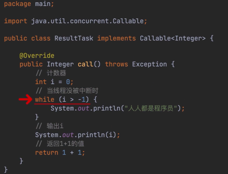 使用while循环无限去判断线程是否被中断,只要线程没被中断,就一直递增i,当线程被中断时,说出i的结果,至此任务改写完成。