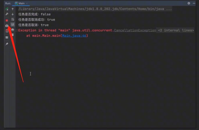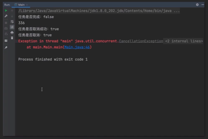 如果任务真的被取消了的话,程序会自动结束,但程序并没有结束,后面还是我们手动的去关闭程序。由此可见,参数为false的情况,即使任务被取消了,但他依然会执行完,如果你调用get方法去获取执行结果的话,还会引发任务取消异常,大家需要注意这一点。
