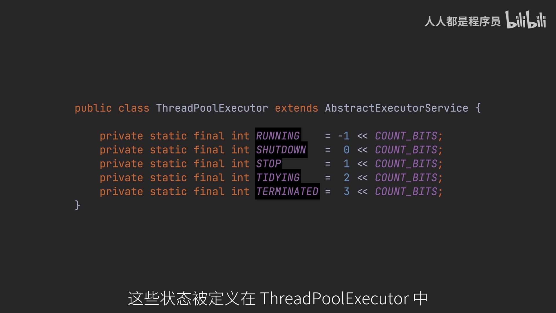 线程池在其生命周期中会经历多种状态,这些状态被定义在threadPoolExecutor中,一共有5种。