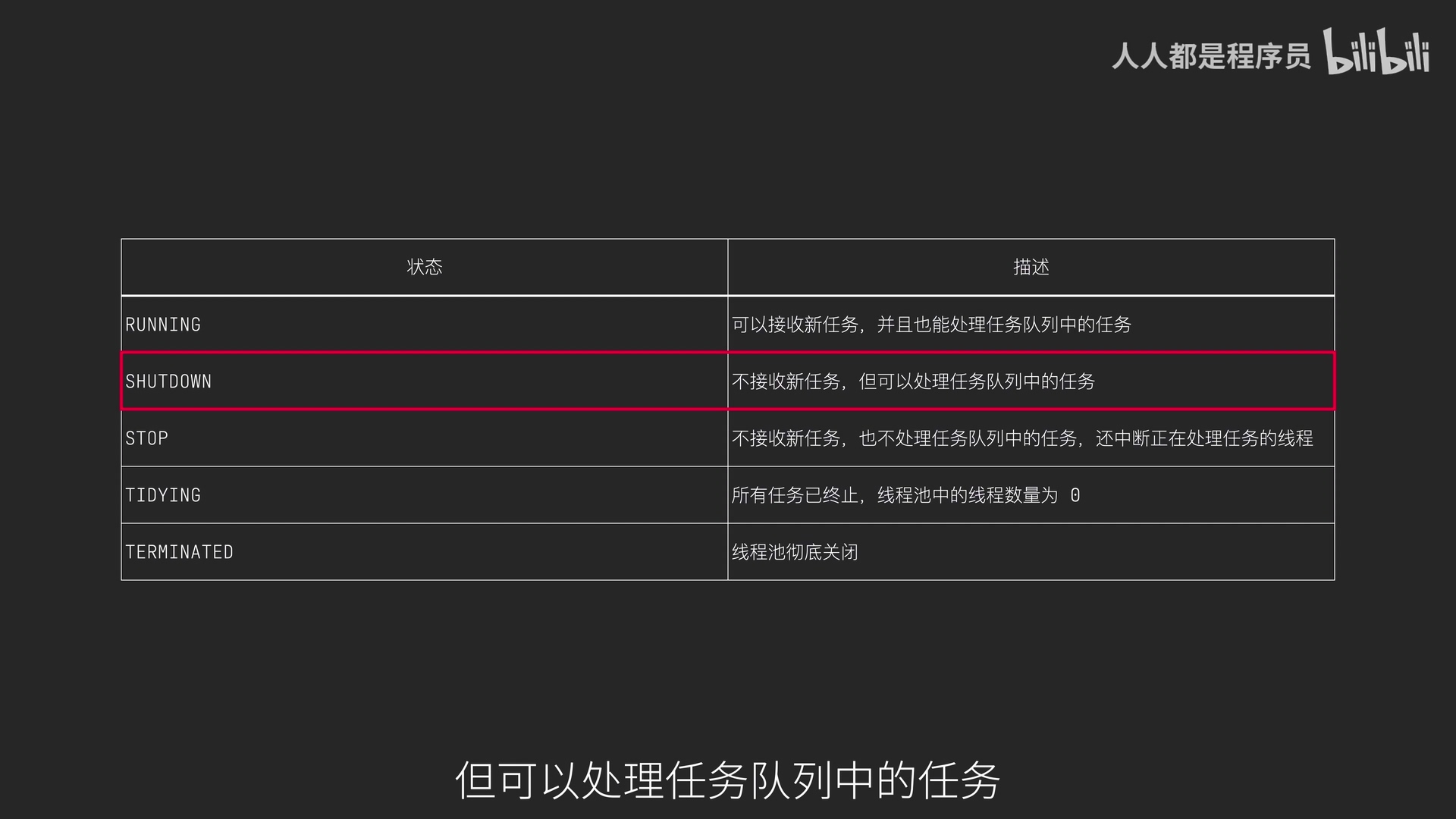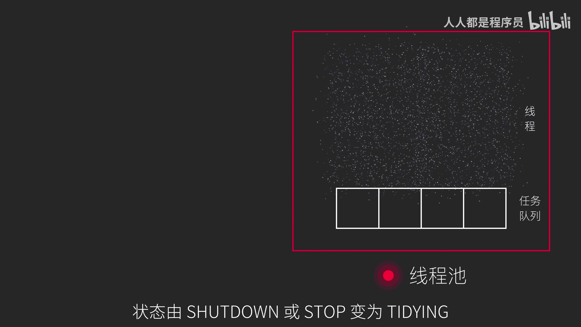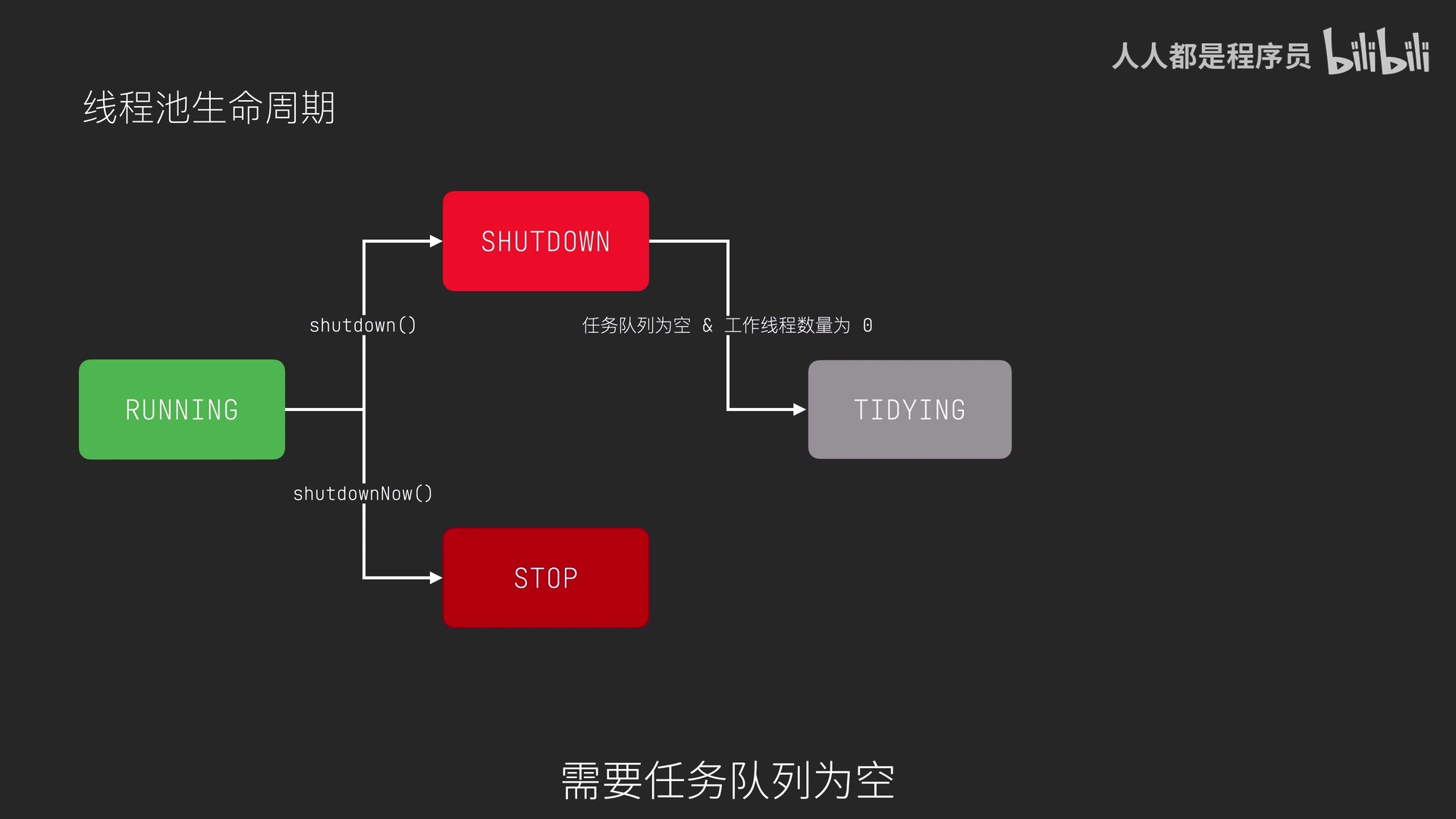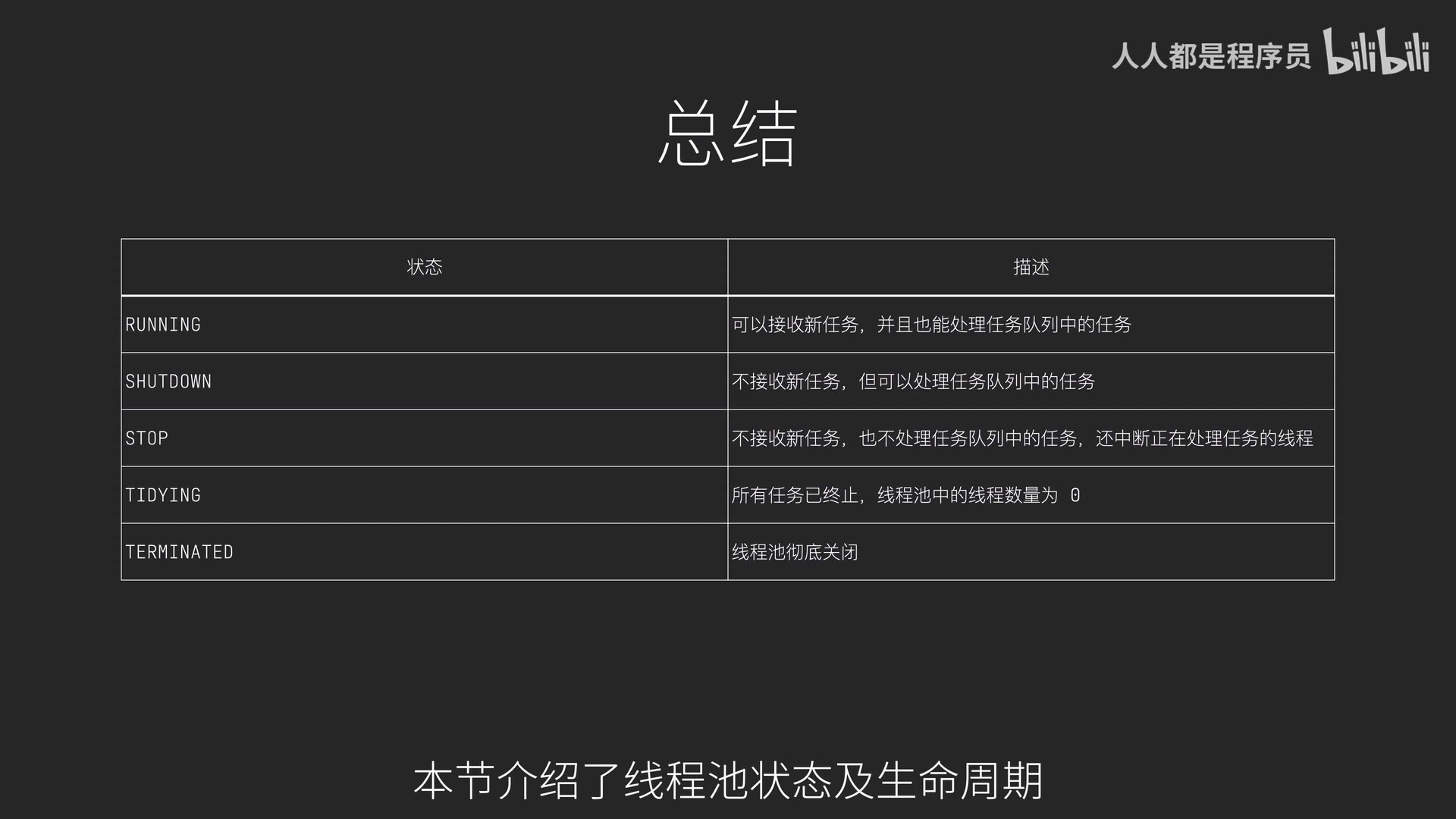 线程池在其生命周期中会经历多种状态,这些状态被定义在threadPoolExecutor中,一共有5种。这些状态所对应的描述如图所示,下面几小节将介绍这些状态。首先来看第一个状态,running,他表示线程池正在运行,可以接受新任务,并且也能处理任务队列中的任务,下面动画演示running状态,这是一个正在运行的线程池。其中有4个正在执行任务的线程,任务队列中还有2个未执行的任务,队列还有空位,我们可以继续向线程池中提交新任务,如果池中没有空闲的线程,那么新任务将会被放入任务队列中,当线程执行完任务时,他们会从任务对应中获取任务,继续执行,直到所有任务全部执行完毕,看完running状态,再来看下一个状态。 shoudown表示线程值准备关闭,不接受新任务,但可以处理任务队列中的任务。下面动画演示shoudown状态,这是一个正在运行的线程池,当我们调用shoudown方法时,现成池的状态就由running变为shoudown,所有提交的任务都会被拒绝,但是池中正在执行的任务依然会继续执行完,这也包括任务队列中还未执行的任务,当队列中的任务都执行完时,线程池状态会由shoudown变为tidying。看完shoudown状态,再来看下一个状态,stop。他表示线程池准备关闭,不接受新任务,也不处理任务对接中的任务,还中断正在执行任务的线程。下面动画演示 stop状态,这是一个正在运行的线程池,当我们调用shoudown方法时,线程池状态由running变为stop,所有提交的先入一律都会被拒绝,而且池中所有正在执行的任务都会被终止。 不仅如此,任务队列中的任务还会返回给调用者,调用者拿到返回的任务以后可以继续执行完,他们现在可以看到线程池变为了一座空线程,下一步就是将这座空城清理掉,shoudown与stop都是在为关闭线程池做准备工作,下一个状态tidying则是线程池正在关闭的状态,此时所有任务已终止,线程池中的线程数量为0。下面动画演示tidying状态,当所有任务都已终止,且时钟工作建成数量也为零时,状态由shoudown或stop变为tidying,此刻的状态表示收尾工作已完成。再来看看最后一个状态,termineted的。他表示线程池彻底关闭,下面动画演示termineted的状态,在收尾工作完成以后,最后调用 termineted的方法彻底将限线程关闭。 至此我们看到了线程池每个状态的变化过程,限制池生命周期也可以画出来了,线程池最初的状态是running,此时线程池正在运行,调用shoudown方法以后状态由running变为shoudown,此时线程值准备关闭,让线程池由正在运行变为准备关闭。还有一种方式,那就是调用shoudownnow方法,状态由running变为stop,在准备工作做完以后就可以开始清理工作了,状态由shoudown变为tidying,需要任务队列为空,工作线程数量为0,也就是要执行完其中所有任务,包括任务队列中的任务状态,由stop变为tidying,只需工作线程数量为0,任务队列中的任务已经返回给调用者了,不需要清空任务队列,最后就用 termineted方法即可让状态由tidying变为termineted,此时的线程池已经彻底完毕。 最后总结一下本节内容,本节介绍了线程池状态及生命周期各状态代表的意思,这里就不再赘述了。另外线程池生命周期如图所示,大家如果有需要的话可以截屏保存下来,这些内容在面试中经常会被问到。