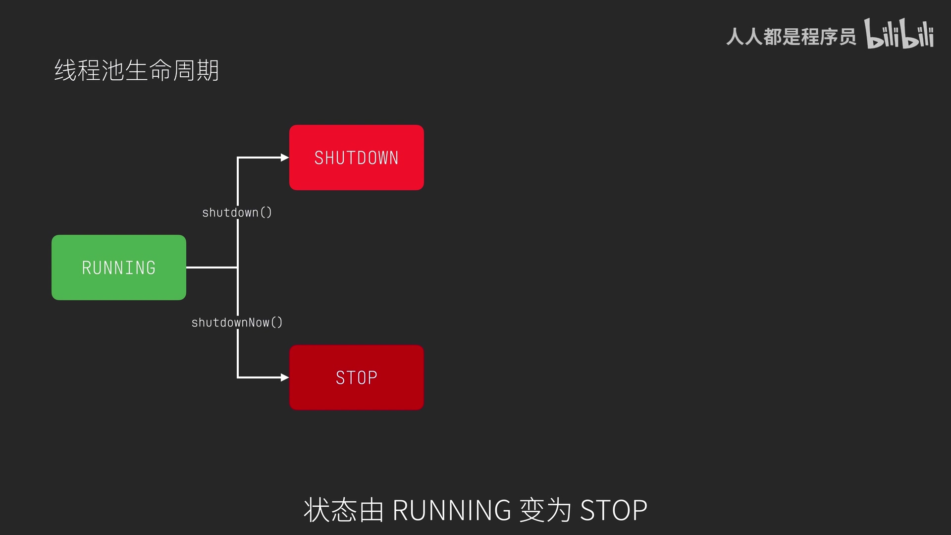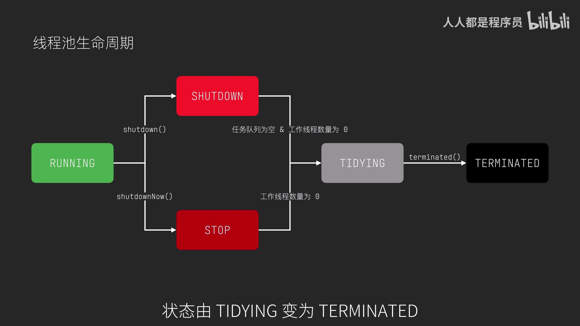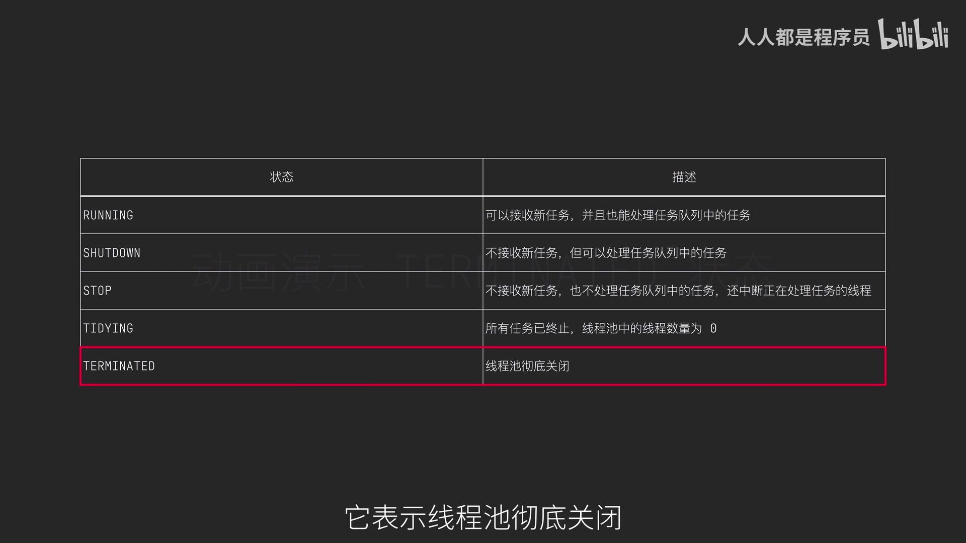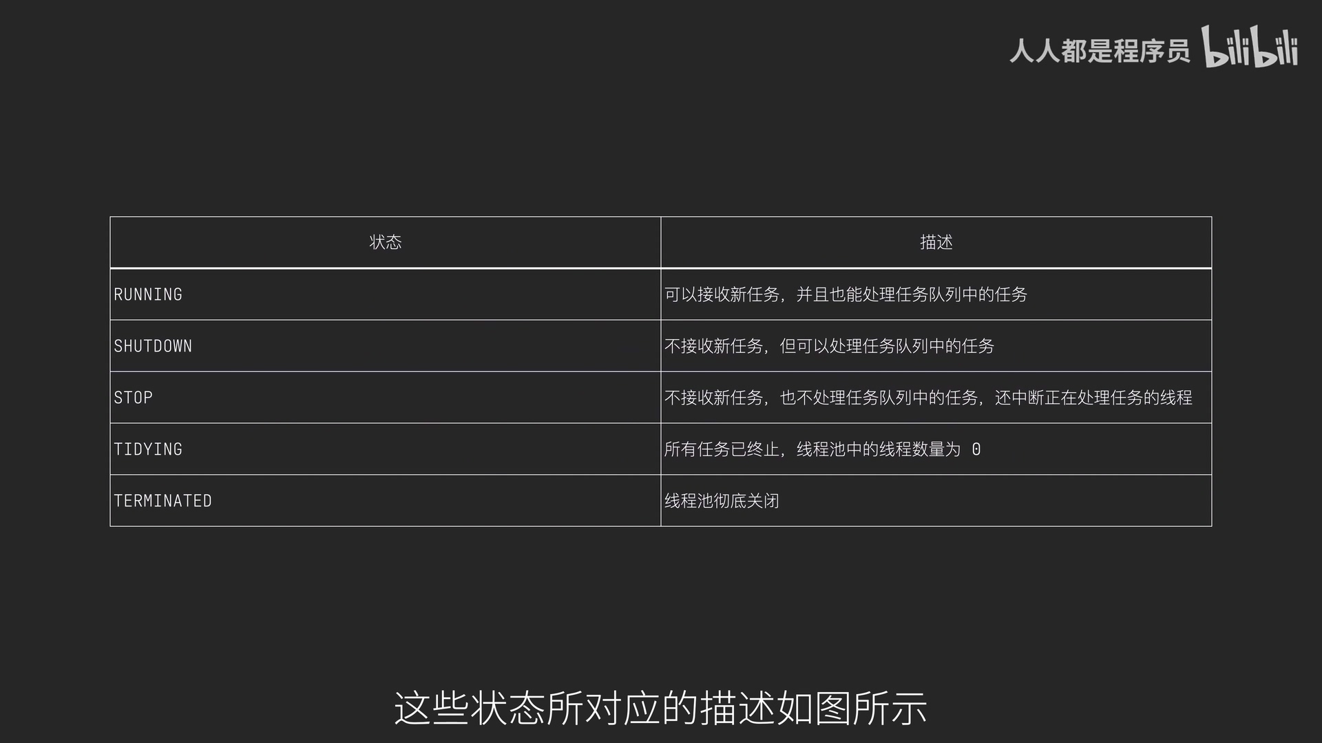 线程池在其生命周期中会经历多种状态,这些状态被定义在threadPoolExecutor中,一共有5种。这些状态所对应的描述如图所示,下面几小节将介绍这些状态。首先来看第一个状态,running,他表示线程池正在运行,可以接受新任务,并且也能处理任务队列中的任务,下面动画演示running状态,这是一个正在运行的线程池。其中有4个正在执行任务的线程,任务队列中还有2个未执行的任务,队列还有空位,我们可以继续向线程池中提交新任务,如果池中没有空闲的线程,那么新任务将会被放入任务队列中,当线程执行完任务时,他们会从任务对应中获取任务,继续执行,直到所有任务全部执行完毕,看完running状态,再来看下一个状态。 shoudown表示线程值准备关闭,不接受新任务,但可以处理任务队列中的任务。下面动画演示shoudown状态,这是一个正在运行的线程池,当我们调用shoudown方法时,现成池的状态就由running变为shoudown,所有提交的任务都会被拒绝,但是池中正在执行的任务依然会继续执行完,这也包括任务队列中还未执行的任务,当队列中的任务都执行完时,线程池状态会由shoudown变为tidying。看完shoudown状态,再来看下一个状态,stop。他表示线程池准备关闭,不接受新任务,也不处理任务对接中的任务,还中断正在执行任务的线程。下面动画演示 stop状态,这是一个正在运行的线程池,当我们调用shoudown方法时,线程池状态由running变为stop,所有提交的先入一律都会被拒绝,而且池中所有正在执行的任务都会被终止。 不仅如此,任务队列中的任务还会返回给调用者,调用者拿到返回的任务以后可以继续执行完,他们现在可以看到线程池变为了一座空线程,下一步就是将这座空城清理掉,shoudown与stop都是在为关闭线程池做准备工作,下一个状态tidying则是线程池正在关闭的状态,此时所有任务已终止,线程池中的线程数量为0。下面动画演示tidying状态,当所有任务都已终止,且时钟工作建成数量也为零时,状态由shoudown或stop变为tidying,此刻的状态表示收尾工作已完成。再来看看最后一个状态,termineted的。他表示线程池彻底关闭,下面动画演示termineted的状态,在收尾工作完成以后,最后调用 termineted的方法彻底将限线程关闭。 至此我们看到了线程池每个状态的变化过程,限制池生命周期也可以画出来了,线程池最初的状态是running,此时线程池正在运行,调用shoudown方法以后状态由running变为shoudown,此时线程值准备关闭,让线程池由正在运行变为准备关闭。还有一种方式,那就是调用shoudownnow方法,状态由running变为stop,在准备工作做完以后就可以开始清理工作了,状态由shoudown变为tidying,需要任务队列为空,工作线程数量为0,也就是要执行完其中所有任务,包括任务队列中的任务状态,由stop变为tidying,只需工作线程数量为0,任务队列中的任务已经返回给调用者了,不需要清空任务队列,最后就用 termineted方法即可让状态由tidying变为termineted,此时的线程池已经彻底完毕。 最后总结一下本节内容,本节介绍了线程池状态及生命周期各状态代表的意思,这里就不再赘述了。另外线程池生命周期如图所示,大家如果有需要的话可以截屏保存下来,这些内容在面试中经常会被问到。